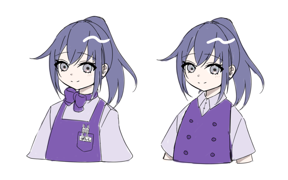 お店の制服姿のぽんとさんを描きたかったのですが、ネットで出てくるお写真と実際にスタッフさんがきていた装いが違っていたので、とりあえず両方とも簡単に描いてみました。